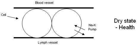 What this literally means is: as long as you have oxygen in the cells, the pumps in the cells will work; they will generate electricity and that electrical energy will give the part of the body, or the system involved, the power to function at an optimum level. The Greatest Health Discovery In 1961, Prof Arthur C. Guyton of the Mississippi School of Medicine offered an understanding which explains how the cells get oxygen. This has become known as the Greatest Health discovery ever made. What Guyton discovered explains how the body can remain free from pain and disease for life. Now this sounds like an enormous statement to make. However bear in mind that this is pure, proven science. Prof Arthur C. Guyton suggested that in order for the cells to receive oxygen, they must be in a ‘DRY STATE’. In this ‘dry state’, he suggested that it would be impossible for the body to experience any discomfort, loss of energy or illness. At a cellular level, the cell structure is paralleled by blood capillaries and lymphatic capillaries. For the ‘dry state’ to occur, there must be only enough fluid to fill the crevices between the cells and that is all. Diagrammatically, it looks like this: |
