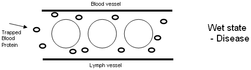 question now follows. What alters the ‘dry state’? To understand this question, is to answer the riddle posed by mankind since the dawn of time. What causes loss of energy, disease and death? There is only one thing that can alter the ‘dry state’. Within in the blood there are three kinds of blood protein. Blood protein is responsible for holding water in the blood. Bear in mind that 91% of the blood is water. Now blood protein molecules are large in relation to the other particulate matter in the blood. As the blood courses through our blood ways carrying the ‘groceries’; the fluid that leaves the blood becomes lymph. Lymph bathes the cellular structures and fills our lymph vessels. A simple analogy of the Lymphatic system is that of a tree. The branches go up to the head and the roots go down to the feet. Running through the centre of the body, we have the trunk. Most people have no understanding about the lymphatic system; and those that do, know it to be part of the body’s defense system. It removes and neutralizes the ‘bad’ guys. However it has an even more important function that is crucial to our health and survival. Blood Proteins In 1930, Dr Cecil K. Drinker of the Harvard Medical School proposed an understanding that still to this day is neither accepted nor taught in the mainstream. He suggested that “the blood capillaries practically universally leak protein”. In 1948, Dr H.S. Mayerson (the father of Lymphology) of the Tulane University School of Medicine, tagged radioactive iodine to the blood protein and discovered that in a 24 hour period, 50% of the blood protein leaves the blood stream. What Prof Guyton discovered, shakes the medical world to its very foundation; and yet for some reason his discoveries are still to this day not taught in medical schools! It is upon this discovery that the Art of Lymphology is based. Quoting directly from the 5th edition of Dr Guyton’s “Textbook of Medical Physiology” on page 397, we find: The lymphatic system represents an accessory route by which fluids can flow from the interstitial spaces back into the blood. And, most important of all, the lymphatics can carry proteins and large particulate matter away from the tissue spaces, neither of which can be removed by absorption directly into the blood capillary. The next statement is of utmost importance: We shall see that this removal of (blood) proteins from the interstitial spaces (by our lymphatic system) IS AN ABSOLUTE ESSENTIAL FUNCTION, WITHOUT WHICH WE WOULD DIE WITHIN ABOUT TWENTY-FOUR HOURS. In the words of J.D. Ratcliff; “But for the prompt retrieval of the protein by the lymphatic system, this constant loss would spell SWIFT CATASTROPHE”. The obvious question MUST be; does the lymphatic system retrieve ALL of the lost blood protein, and if not; what happens? This is where the work of Dr. C. Samuel West reaches Nobel Prize proportions. Blood proteins hold water in the blood vessels. It would therefore make sense that if they were to remain in the interstitial spaces, they would also hold water. This would alter Guyton’s much needed ‘Dry State’ to a ‘Wet State’. If the ‘Dry State’ is the condition needed by the cells to receive, oxygen and maintain a healthful body, then the ‘Wet State’ must naturally produce the opposite conditions. A lack of oxygen at a cellular level, which would disrupt the production of ATP, switch off the pumps and cause an imbalance in the delicate mineral balance. The result, THE GENERATORS SWITCH OFF! Trapped blood proteins will attract excess sodium and will pull water out of the blood stream to produce excess fluids and excess sodium around the cells which are the conditions that will cause a lack of oxygen and will upset the delicate sodium-potassium balance in and around the cells which will cause loss of energy, disease or death at a cell level. Diagrammatically, it looks like this: |